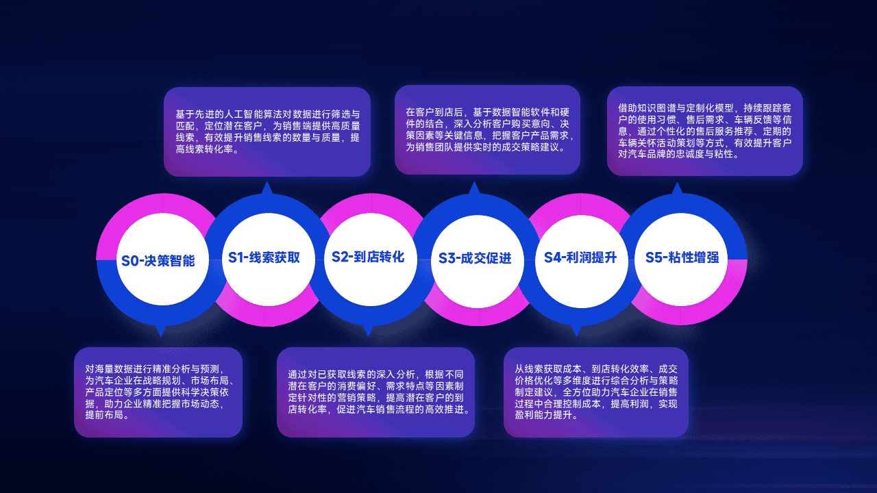 基于销售转化漏斗的薄弱环节,,,为客户提供数据+模型+运营的智能应用,,,,实现销售业绩的提升;推动线索管理全链路的精细化管理和运营。。。